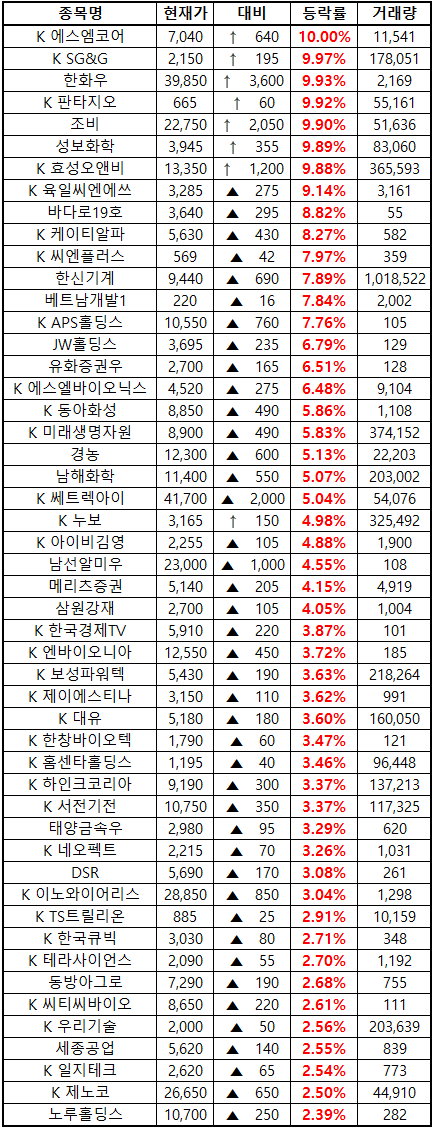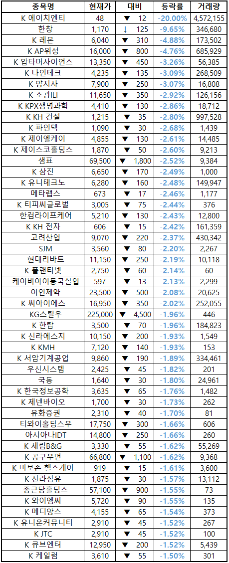 (종목명 앞에 'K'는 코스닥 종목을 의미합니다.)