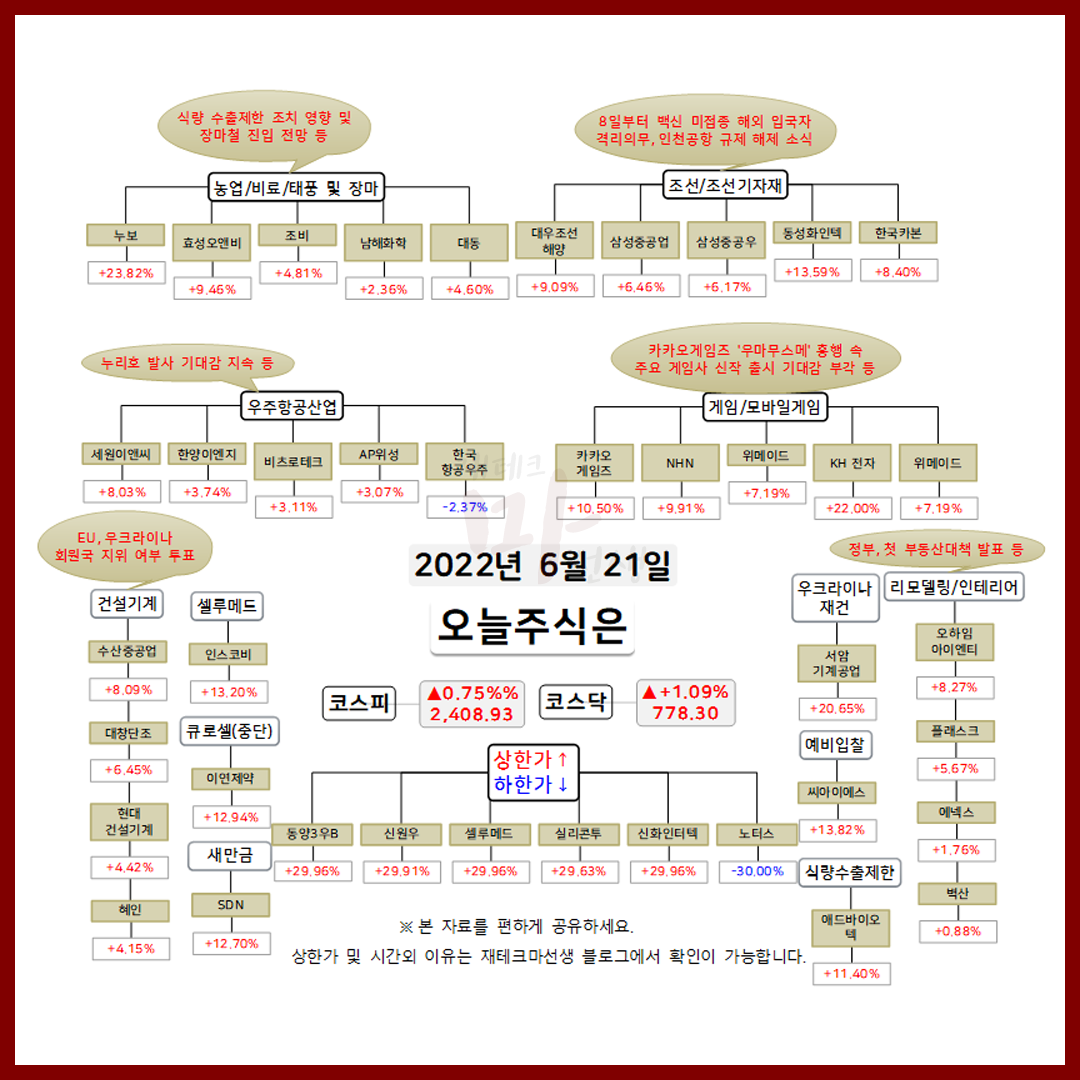 2022년 6월 21일 오늘의 상한가 종목 및 이유 :: 셀루메드 신화인터텍 실리콘투 주가 외 지난 뉴욕증시는 노예해방의 날 대체휴일로 휴장이였습니다. 금일 코스피 지수는 +0.75% 상승한 2,408.93에 마