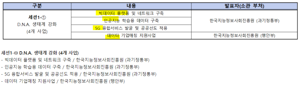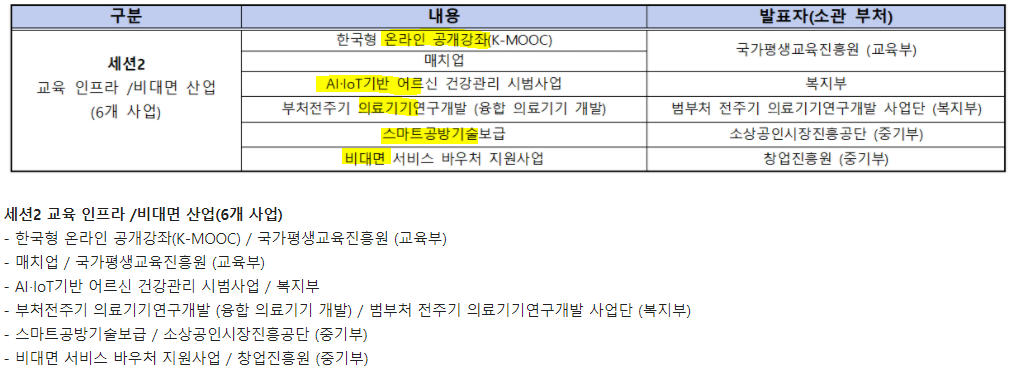지난 1월에 정부가 발표했던 '2021 디지털뉴딜 실행계획'을 토대로 총 7조6천억의 예산이 투입될 예정 가운데 구체적으로는 인공지능 학습용 데이터구축(2천925억원), 데이터 기업매칭 지원(400억원), 실감형 콘텐츠 제작지원(308억원), 비대면 서비스 바우처 지원사업(2천160억원) 등의 교육 인프라 고도화와 비대면 산업 육성 내용이 나올 것으로 보여지고 있습니다.