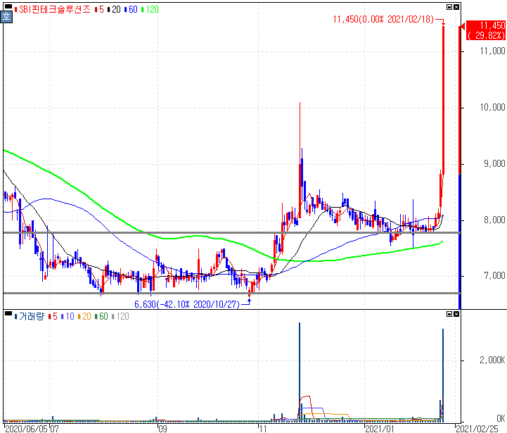 차트에서 보여지는 추세와 수급 등을 토대로 한 재료까지 갖추어진다면 좋은 결과를 볼 수 있다고 말씀드렸던 만큼 지난 11월에 급등을 보였던 SBI핀테크솔루션즈 입니다. 이후로 크게 부각을 보이지 않던 흐름이였지만 시세가 유지되어오면서 재반등을 보인 모습입니다.